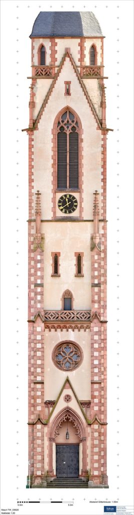 The four facades of the church tower – 42 meters high – were documented by 2D rectified images in the scale 1:20 and 300 dpi resolution. This corresponds to a pixel resolution of 1.7 mm at the object.